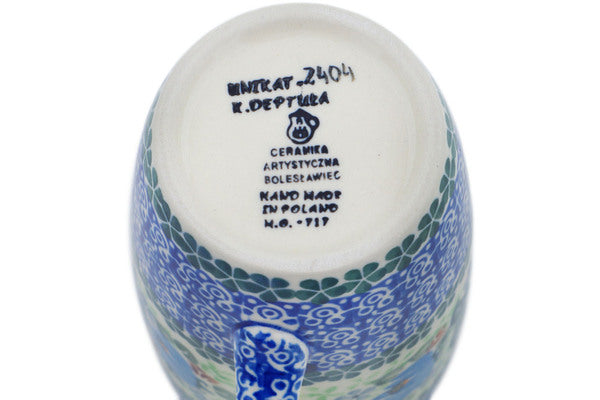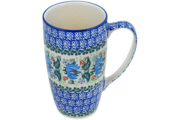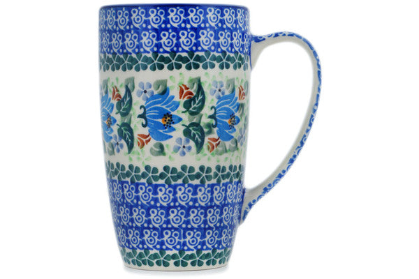 This Blue Beauty 14 oz Latte Mug was handmade and hand decorated in Boleslawiec, Poland by skilled artisans according to old traditional methods. This is a Polish pottery Signature Unikat, which means that it has been hand painted with both sponges and brushes and it is signed by the artist who painted it. Unikat pieces are the most intricate works of art. Larger Unikat items take hours of very careful work to finish. This Polish stoneware is microwave, dishwasher, freezer, and oven safe up to 480°F. It does not contain lead or cadmium. It is part of the Blue Beauty Collection.