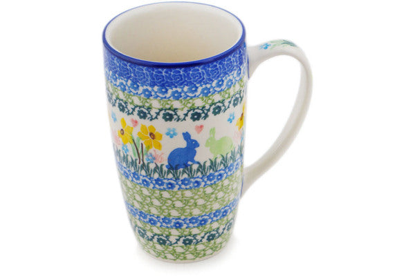 This Hopping In Love 14 oz Latte Mug was handmade and hand decorated in Boleslawiec, Poland by skilled artisans according to old traditional methods. This Polish stoneware is microwave, dishwasher, freezer, and oven safe up to 480°F. It does not contain lead or cadmium. It is part of the Hopping In Love Collection.