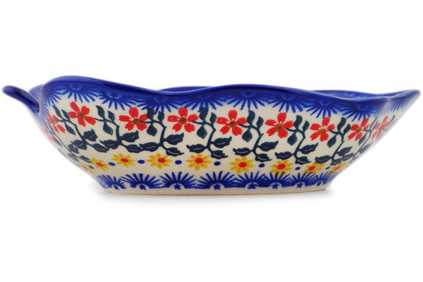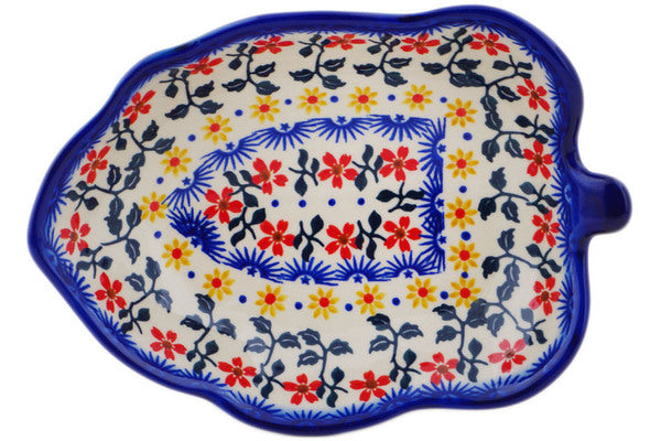 This Sunflower Dance 8" Leaf Shaped Bowl was handmade and hand decorated in Boleslawiec, Poland by skilled artisans according to old traditional methods. This Polish stoneware is microwave, dishwasher, freezer, and oven safe up to 480°F. It does not contain lead or cadmium. It is part of the Sunflower Dance Collection.
