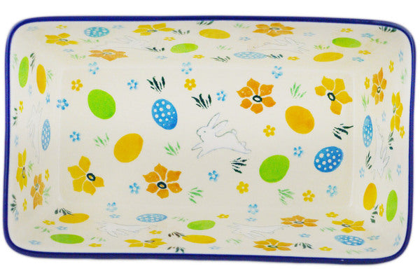This Egg Hunt 8" Loaf Pan 8" was handmade and hand decorated in Boleslawiec, Poland by skilled artisans according to old traditional methods. This Polish stoneware is microwave, dishwasher, freezer, and oven safe up to 480°F. It does not contain lead or cadmium. It is part of the Egg Hunt Collection.