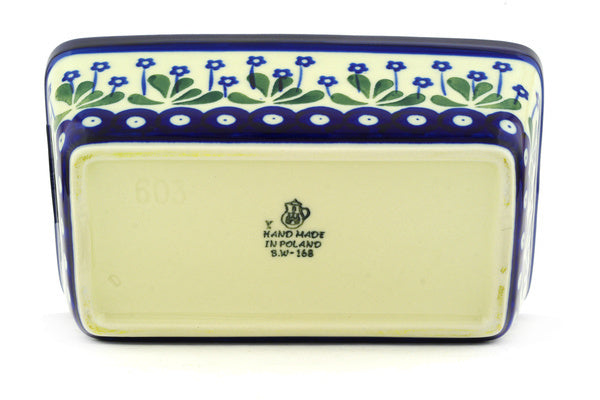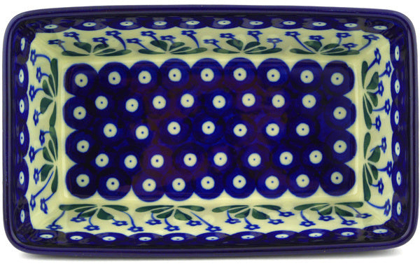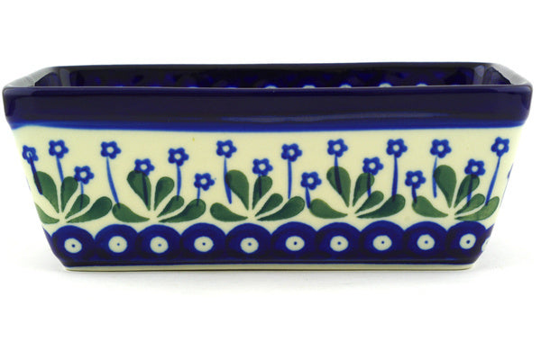 This Forget-Me-Not Peacock 8" Loaf Pan 8" was handmade and hand decorated in Boleslawiec, Poland by skilled artisans according to old traditional methods. This Polish stoneware is microwave, dishwasher, freezer, and oven safe up to 480°F. It does not contain lead or cadmium. It is part of the Forget-Me-Not Peacock Collection.