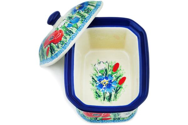 This Polish Fields 4" Mini Cake Box 4", Salt Box, was handmade and hand decorated in Boleslawiec, Poland by skilled artisans according to old traditional methods. This is a Polish pottery Signature Unikat, which means that it has been hand painted with both sponges and brushes and it is signed by the artist who painted it. Unikat pieces are the most intricate works of art. Larger Unikat items take hours of very careful work to finish. This Polish stoneware is microwave, dishwasher, freezer, and oven safe up to 480°F. It does not contain lead or cadmium. It is part of the Polish Fields Collection.