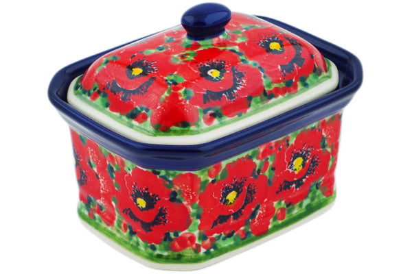 This Savvy Scarlet 4" Mini Cake Box 4", Salt Box, was handmade and hand decorated in Boleslawiec, Poland by skilled artisans according to old traditional methods. This is a Polish pottery Signature Unikat, which means that it has been hand painted with both sponges and brushes and it is signed by the artist who painted it. Unikat pieces are the most intricate works of art. Larger Unikat items take hours of very careful work to finish. This Polish stoneware is microwave, dishwasher, freezer, and oven safe up to 480°F. It does not contain lead or cadmium. It is part of the Savvy Scarlet Collection.