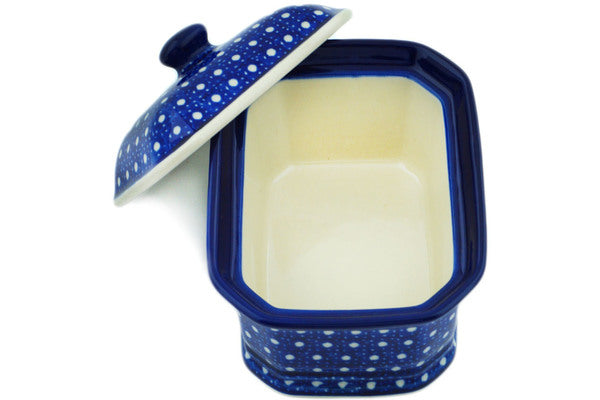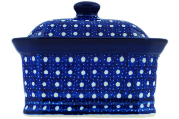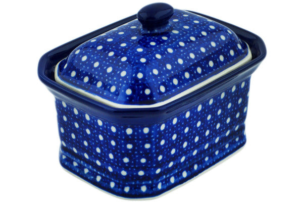 This White Polka Dot 4" Mini Cake Box 4", Salt Box, was handmade and hand decorated in Boleslawiec, Poland by skilled artisans according to old traditional methods. This is a Polish pottery Signature Unikat, which means that it has been hand painted with both sponges and brushes and it is signed by the artist who painted it. Unikat pieces are the most intricate works of art. Larger Unikat items take hours of very careful work to finish. This Polish stoneware is microwave, dishwasher, freezer, and oven safe up to 480°F. It does not contain lead or cadmium. It is part of the White Polka Dot Collection.