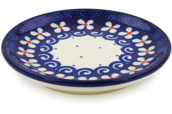 This Dots And Daisies 4" Mini Plate, Coaster plate was handmade and hand decorated in Boleslawiec, Poland by skilled artisans according to old traditional methods. This Polish stoneware is microwave, dishwasher, freezer, and oven safe up to 480°F. It does not contain lead or cadmium. It is part of the Dots And Daisies Collection.