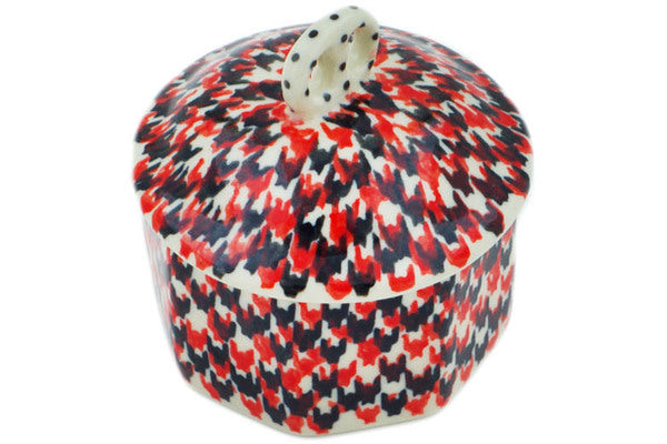 This Bold Houndstooth 3" Mini Pretzel Jar 3" was handmade and hand decorated in Boleslawiec, Poland by skilled artisans according to old traditional methods. This Polish stoneware is microwave, dishwasher, freezer, and oven safe up to 480°F. It does not contain lead or cadmium. It is part of the Bold Houndstooth Collection.
