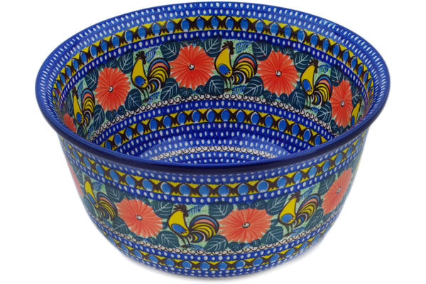 This Summer Rooster 12-inch (8 quarts) Mixing Bowl was handmade and hand decorated in Boleslawiec, Poland by skilled artisans according to old traditional methods. This is a Polish pottery Signature Unikat, which means that it has been hand painted with both sponges and brushes and it is signed by the artist who painted it. Unikat pieces are the most intricate works of art. Larger Unikat items take hours of very careful work to finish. This Polish stoneware is microwave, dishwasher, freezer, and oven safe up to 480°F. It does not contain lead or cadmium. It is part of the Summer Rooster Collection.