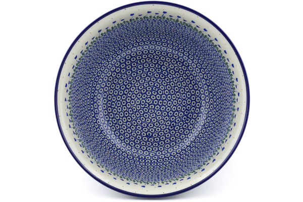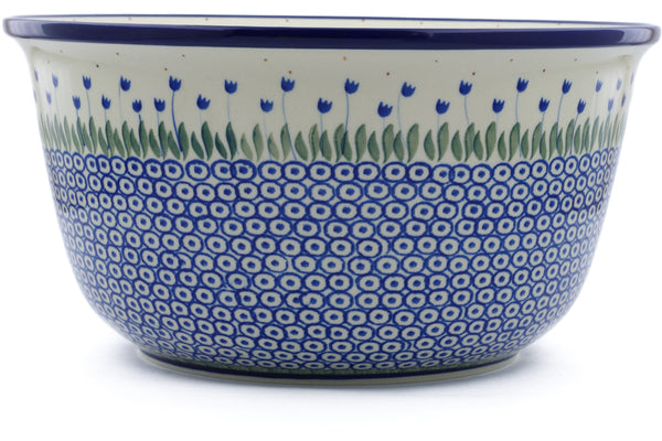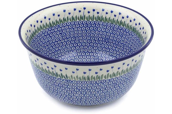 This Water Tulip 12-inch (8 quarts) Mixing Bowl was handmade and hand decorated in Boleslawiec, Poland by skilled artisans according to old traditional methods. This Polish stoneware is microwave, dishwasher, freezer, and oven safe up to 480°F. It does not contain lead or cadmium. It is part of the Water Tulip Collection.