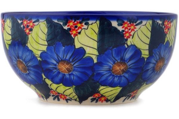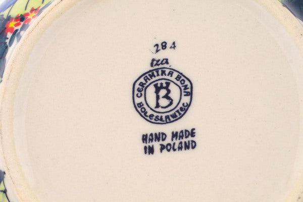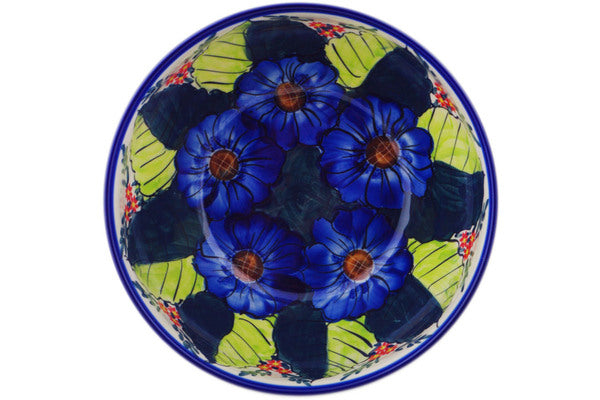 This Blue Bouquet 9" Mixing bowl, serving bowl was handmade and hand decorated in Boleslawiec, Poland by skilled artisans according to old traditional methods. This is a Polish pottery Signature Unikat, which means that it has been hand painted with both sponges and brushes and it is signed by the artist who painted it. Unikat pieces are the most intricate works of art. Larger Unikat items take hours of very careful work to finish. This Polish stoneware is microwave, dishwasher, freezer, and oven safe up to 480°F. It does not contain lead or cadmium. It is part of the Blue Bouquet Collection.