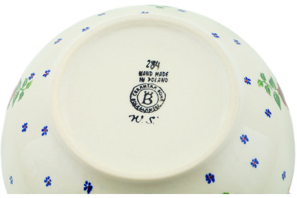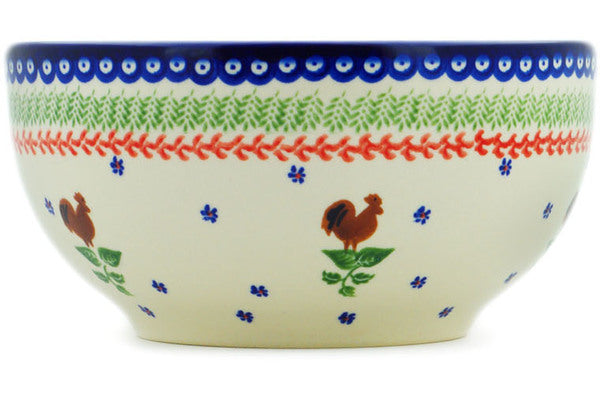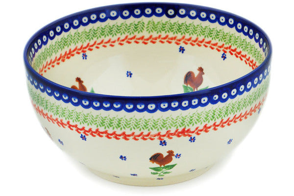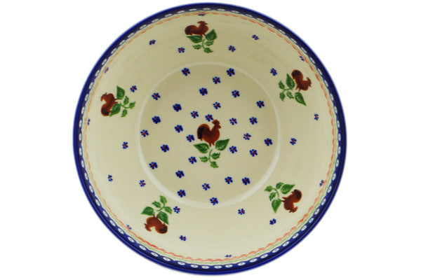 This Spring Rooster 9" Mixing bowl, serving bowl was handmade and hand decorated in Boleslawiec, Poland by skilled artisans according to old traditional methods. This Polish stoneware is microwave, dishwasher, freezer, and oven safe up to 480°F. It does not contain lead or cadmium. It is part of the Spring Rooster Collection.