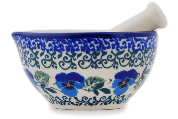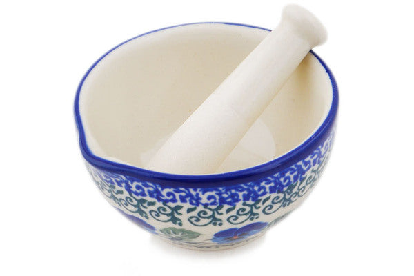 This Blue Pansy Small Mortar and Pestle was handmade and hand decorated in Boleslawiec, Poland by skilled artisans according to old traditional methods. This Polish stoneware is microwave, dishwasher, freezer, and oven safe up to 480°F. It does not contain lead or cadmium. It is part of the Blue Pansy Collection.