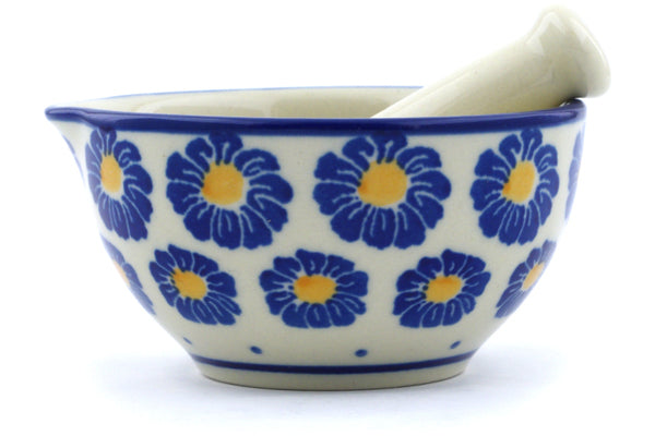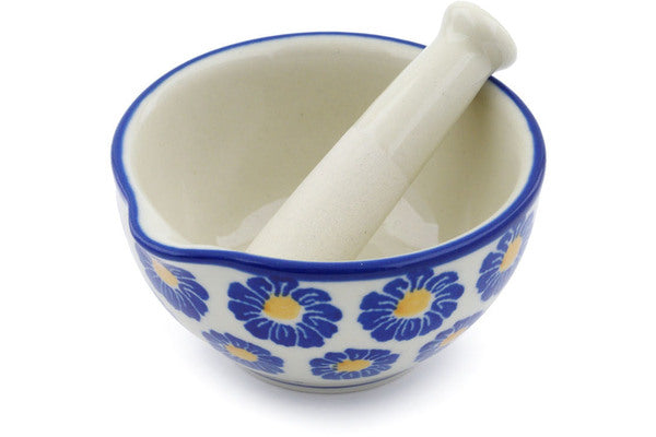 This Blue Zinnia Small Mortar and Pestle was handmade and hand decorated in Boleslawiec, Poland by skilled artisans according to old traditional methods. This Polish stoneware is microwave, dishwasher, freezer, and oven safe up to 480°F. It does not contain lead or cadmium. It is part of the Blue Zinnia Collection.