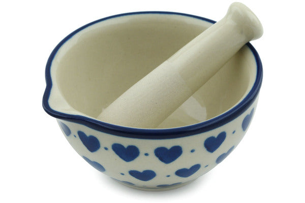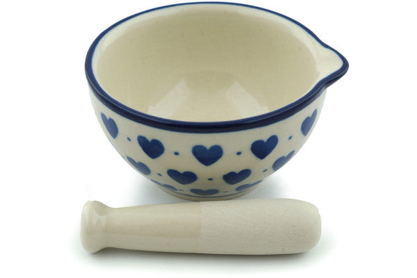 This Hearts Delight Small Mortar and Pestle was handmade and hand decorated in Boleslawiec, Poland by skilled artisans according to old traditional methods. This Polish stoneware is microwave, dishwasher, freezer, and oven safe up to 480°F. It does not contain lead or cadmium. It is part of the Hearts Delight Collection.