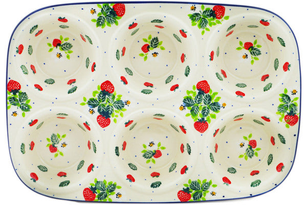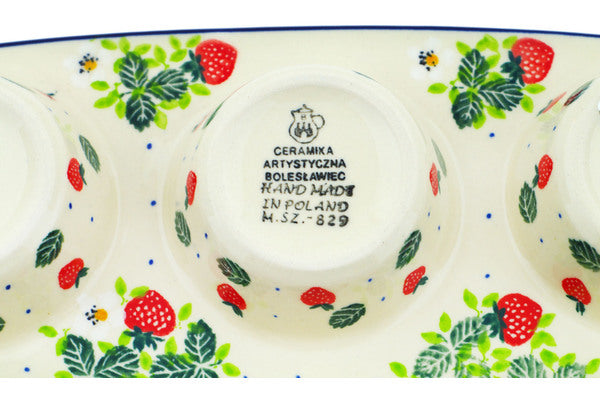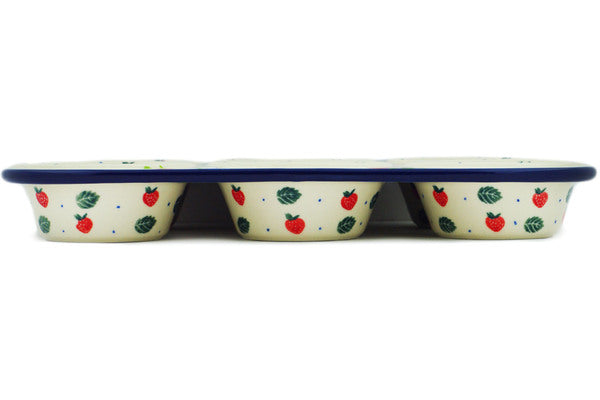 This Berry Burst 11" Muffin Pan was handmade and hand decorated in Boleslawiec, Poland by skilled artisans according to old traditional methods. This Polish stoneware is microwave, dishwasher, freezer, and oven safe up to 480°F. It does not contain lead or cadmium. It is part of the Berry Burst Collection.