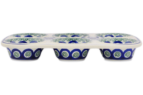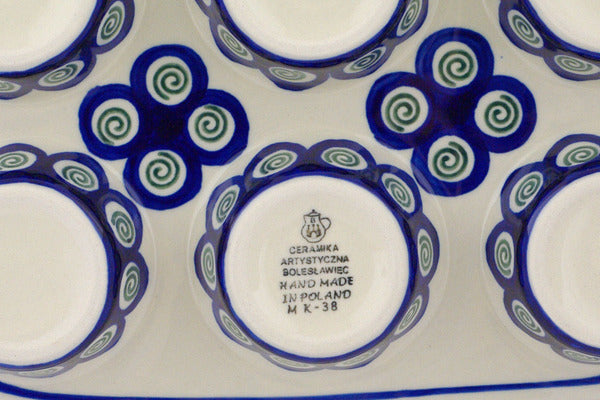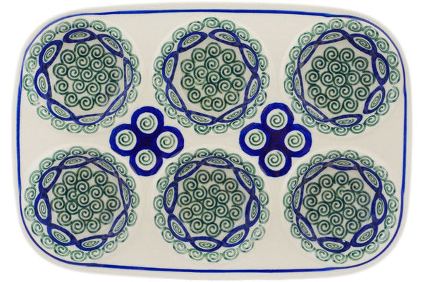 This Green Peacock Swirl 11" Muffin Pan was handmade and hand decorated in Boleslawiec, Poland by skilled artisans according to old traditional methods. This Polish stoneware is microwave, dishwasher, freezer, and oven safe up to 480°F. It does not contain lead or cadmium. It is part of the Green Peacock Swirl Collection.