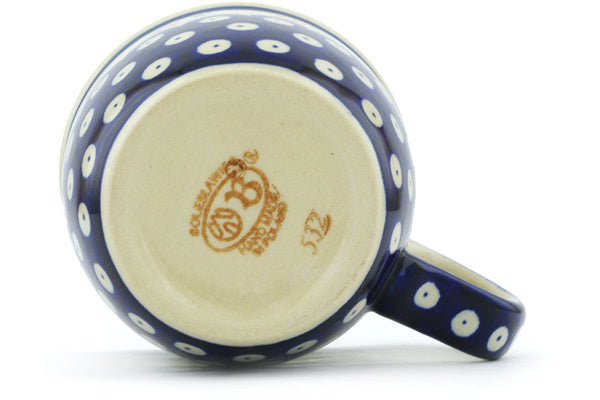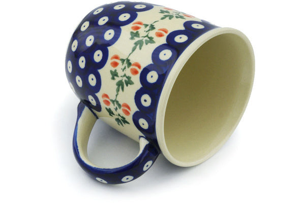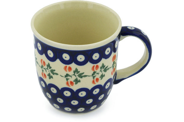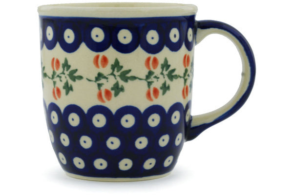 This Peachy Peacock 12 oz Mug was handmade and hand decorated in Boleslawiec, Poland by skilled artisans according to old traditional methods. This Polish stoneware is microwave, dishwasher, freezer, and oven safe up to 480°F. It does not contain lead or cadmium. It is part of the Peachy Peacock Collection.