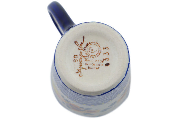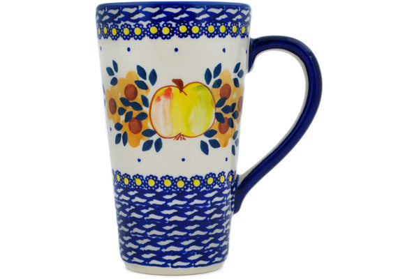 This Apple 13 oz Mug was handmade and hand decorated in Boleslawiec, Poland by skilled artisans according to old traditional methods. This is a Polish pottery Signature Unikat, which means that it has been hand painted with both sponges and brushes and it is signed by the artist who painted it. Unikat pieces are the most intricate works of art. Larger Unikat items take hours of very careful work to finish. This Polish stoneware is microwave, dishwasher, freezer, and oven safe up to 480°F. It does not contain lead or cadmium. It is part of the Apple Collection.