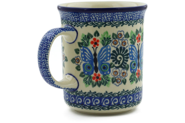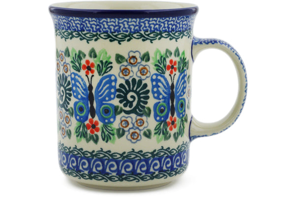 This Blue Butterfly Brigade 15 oz Mug was handmade and hand decorated in Boleslawiec, Poland by skilled artisans according to old traditional methods. This is a Polish pottery Signature Unikat, which means that it has been hand painted with both sponges and brushes and it is signed by the artist who painted it. Unikat pieces are the most intricate works of art. Larger Unikat items take hours of very careful work to finish. This Polish stoneware is microwave, dishwasher, freezer, and oven safe up to 480°F. It does not contain lead or cadmium. It is part of the Blue Butterfly Brigade Collection.