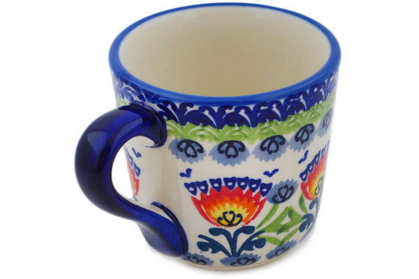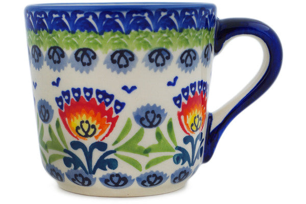 This Flower Flames 8 oz Mug was handmade and hand decorated in Boleslawiec, Poland by skilled artisans according to old traditional methods. This is a Polish pottery Signature Unikat, which means that it has been hand painted with both sponges and brushes and it is signed by the artist who painted it. Unikat pieces are the most intricate works of art. Larger Unikat items take hours of very careful work to finish. This Polish stoneware is microwave, dishwasher, freezer, and oven safe up to 480°F. It does not contain lead or cadmium. It is part of the Flower Flames Collection.