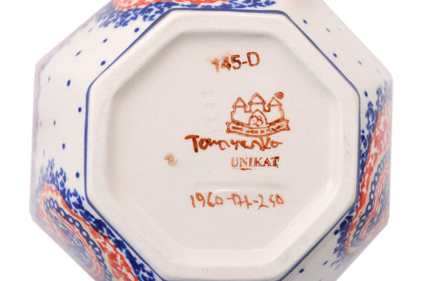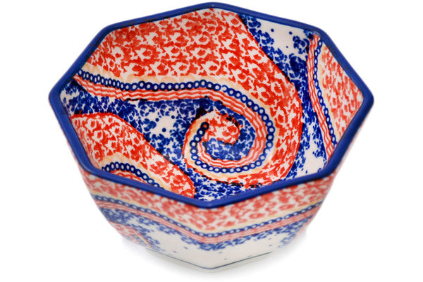 This Spiral Joy 5" Octagonal Bowl was handmade and hand decorated in Boleslawiec, Poland by skilled artisans according to old traditional methods. This is a Polish pottery Signature Unikat, which means that it has been hand painted with both sponges and brushes and it is signed by the artist who painted it. Unikat pieces are the most intricate works of art. Larger Unikat items take hours of very careful work to finish. This Polish stoneware is microwave, dishwasher, freezer, and oven safe up to 480°F. It does not contain lead or cadmium. It is part of the Spiral Joy Collection.