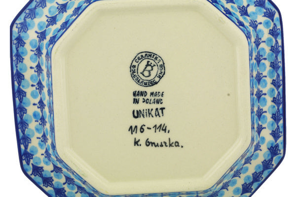 This Bold Poppies 8" Octagonal Bowl was handmade and hand decorated in Boleslawiec, Poland by skilled artisans according to old traditional methods. This is a Polish pottery Signature Unikat, which means that it has been hand painted with both sponges and brushes and it is signed by the artist who painted it. Unikat pieces are the most intricate works of art. Larger Unikat items take hours of very careful work to finish. This Polish stoneware is microwave, dishwasher, freezer, and oven safe up to 480°F. It does not contain lead or cadmium. It is part of the Bold Poppies Collection.