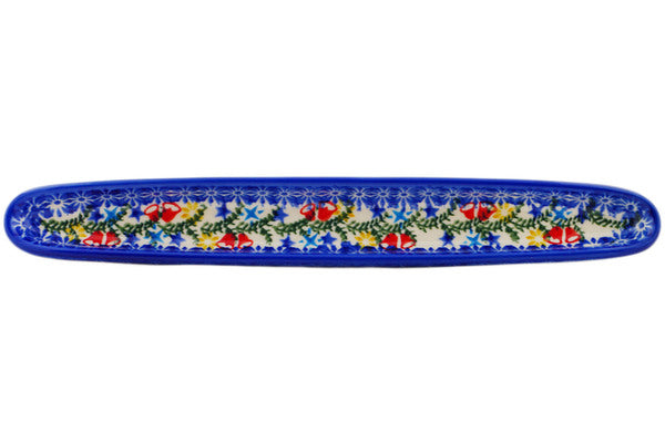 This Wreath Of Bells 13" Olive Dish was handmade and hand decorated in Boleslawiec, Poland by skilled artisans according to old traditional methods. This Polish stoneware is microwave, dishwasher, freezer, and oven safe up to 480°F. It does not contain lead or cadmium. It is part of the Wreath Of Bells Collection.