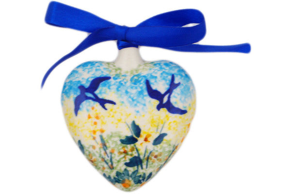 This Birds In The Sunset 3" Ornament Heart was handmade and hand decorated in Boleslawiec, Poland by skilled artisans according to old traditional methods. This is a Polish pottery Signature Unikat, which means that it has been hand painted with both sponges and brushes and it is signed by the artist who painted it. Unikat pieces are the most intricate works of art. Larger Unikat items take hours of very careful work to finish. This Polish stoneware is microwave, dishwasher, freezer, and oven safe up to 480°F. It does not contain lead or cadmium. It is part of the Birds In The Sunset Collection.