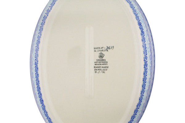 This Deep Winter 12" Oval Baker was handmade and hand decorated in Boleslawiec, Poland by skilled artisans according to old traditional methods. This is a Polish pottery Signature Unikat, which means that it has been hand painted with both sponges and brushes and it is signed by the artist who painted it. Unikat pieces are the most intricate works of art. Larger Unikat items take hours of very careful work to finish. This Polish stoneware is microwave, dishwasher, freezer, and oven safe up to 480°F. It does not contain lead or cadmium. It is part of the Deep Winter Collection.
