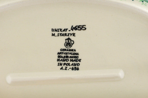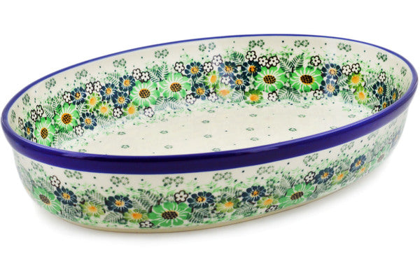 This Green Wreath 12" Oval Baker was handmade and hand decorated in Boleslawiec, Poland by skilled artisans according to old traditional methods. This is a Polish pottery Signature Unikat, which means that it has been hand painted with both sponges and brushes and it is signed by the artist who painted it. Unikat pieces are the most intricate works of art. Larger Unikat items take hours of very careful work to finish. This Polish stoneware is microwave, dishwasher, freezer, and oven safe up to 480°F. It does not contain lead or cadmium. It is part of the Green Wreath Collection.