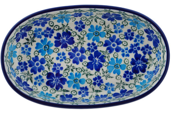 This Fields Of Blue 8" Oval Baker was handmade and hand decorated in Boleslawiec, Poland by skilled artisans according to old traditional methods. This is a Polish pottery Signature Unikat, which means that it has been hand painted with both sponges and brushes and it is signed by the artist who painted it. Unikat pieces are the most intricate works of art. Larger Unikat items take hours of very careful work to finish. This Polish stoneware is microwave, dishwasher, freezer, and oven safe up to 480°F. It does not contain lead or cadmium. It is part of the Fields Of Blue Collection.