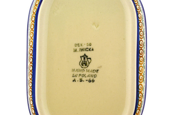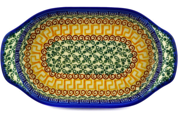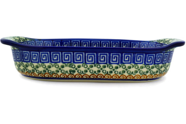 This Grecian Sea 8" Oval Baker with Handles was handmade and hand decorated in Boleslawiec, Poland by skilled artisans according to old traditional methods. This Polish stoneware is microwave, dishwasher, freezer, and oven safe up to 480°F. It does not contain lead or cadmium. It is part of the Grecian Sea Collection.