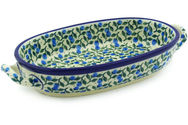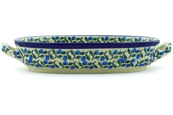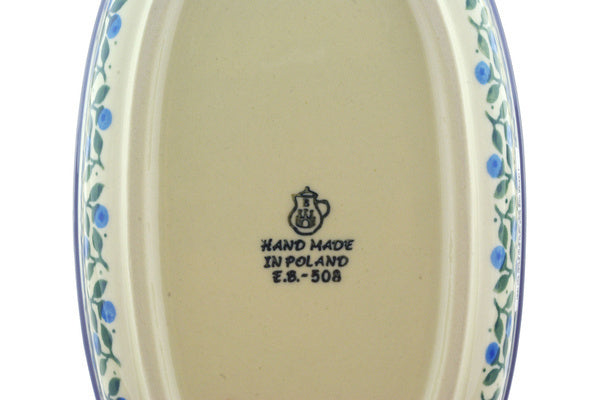 This Blueberry Vine 8-inch Oval Baker with Handles was handmade and hand decorated in Boleslawiec, Poland by skilled artisans according to old traditional methods. This Polish stoneware is microwave, dishwasher, freezer, and oven safe up to 480°F. It does not contain lead or cadmium. It is part of the Blueberry Vine Collection.