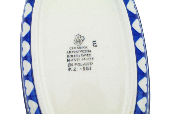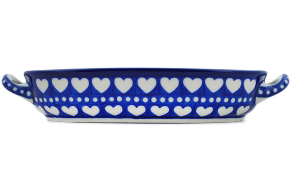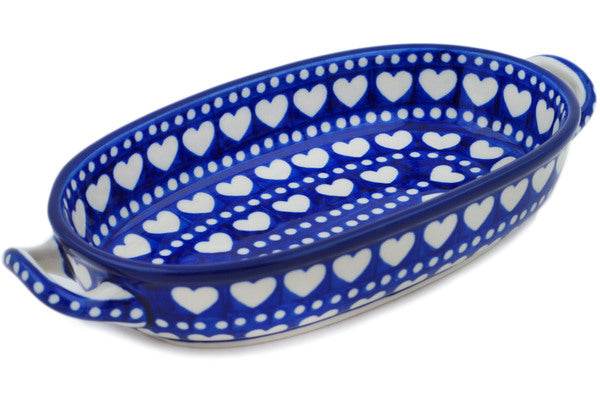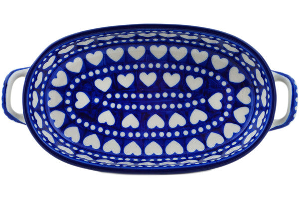 This Heart To Heart 8-inch Oval Baker with Handles was handmade and hand decorated in Boleslawiec, Poland by skilled artisans according to old traditional methods. This Polish stoneware is microwave, dishwasher, freezer, and oven safe up to 480°F. It does not contain lead or cadmium. It is part of the Heart To Heart Collection.
