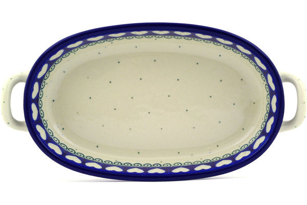 This Light Hearted 8-inch Oval Baker with Handles was handmade and hand decorated in Boleslawiec, Poland by skilled artisans according to old traditional methods. This Polish stoneware is microwave, dishwasher, freezer, and oven safe up to 480°F. It does not contain lead or cadmium. It is part of the Light Hearted Collection.