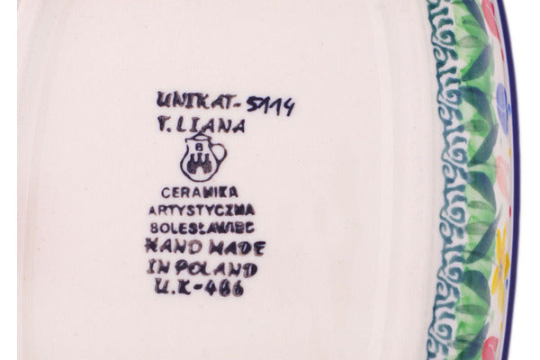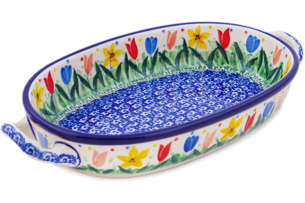 This Summer Tulip 8-inch Oval Baker with Handles was handmade and hand decorated in Boleslawiec, Poland by skilled artisans according to old traditional methods. This is a Polish pottery Signature Unikat, which means that it has been hand painted with both sponges and brushes and it is signed by the artist who painted it. Unikat pieces are the most intricate works of art. Larger Unikat items take hours of very careful work to finish. This Polish stoneware is microwave, dishwasher, freezer, and oven safe up to 480°F. It does not contain lead or cadmium. It is part of the Summer Tulip Collection.