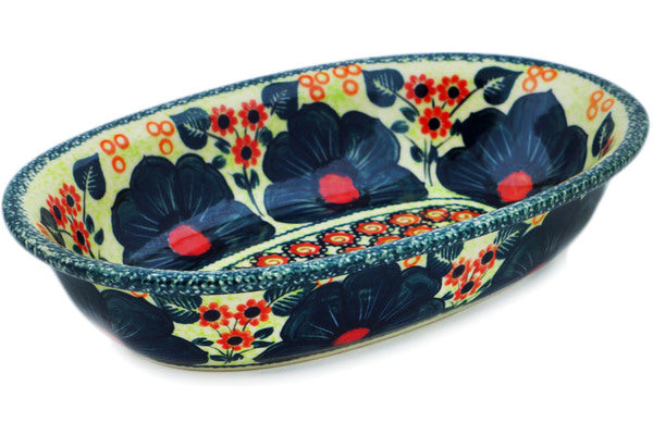 This Perfect Day 6" Oval Bowl was handmade and hand decorated in Boleslawiec, Poland by skilled artisans according to old traditional methods. This is a Polish pottery Signature Unikat, which means that it has been hand painted with both sponges and brushes and it is signed by the artist who painted it. Unikat pieces are the most intricate works of art. Larger Unikat items take hours of very careful work to finish. This Polish stoneware is microwave, dishwasher, freezer, and oven safe up to 480°F. It does not contain lead or cadmium. It is part of the Perfect Day Collection.
