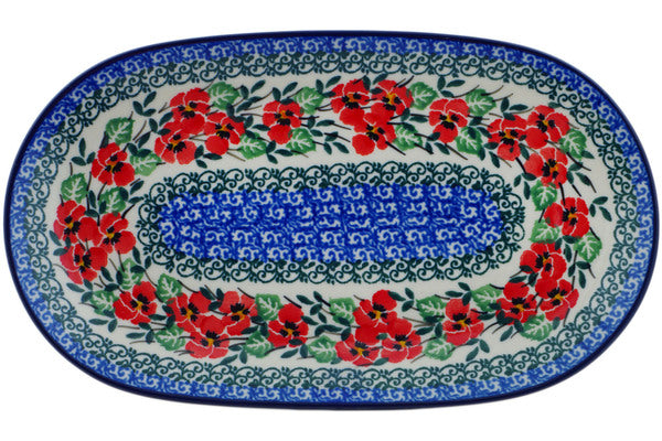 This Red Pansy 10" Oval Platter was handmade and hand decorated in Boleslawiec, Poland by skilled artisans according to old traditional methods. This Polish stoneware is microwave, dishwasher, freezer, and oven safe up to 480°F. It does not contain lead or cadmium. It is part of the Red Pansy Collection.