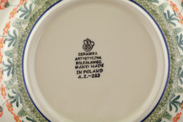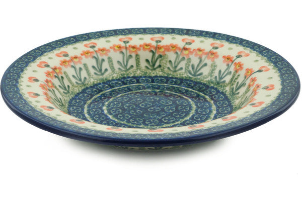 This Peach Spring Daisy 9" Pasta Bowl was handmade and hand decorated in Boleslawiec, Poland by skilled artisans according to old traditional methods. This Polish stoneware is microwave, dishwasher, freezer, and oven safe up to 480°F. It does not contain lead or cadmium. It is part of the Peach Spring Daisy Collection.
