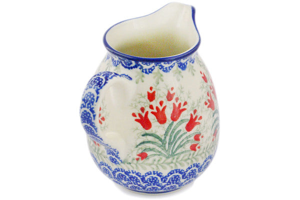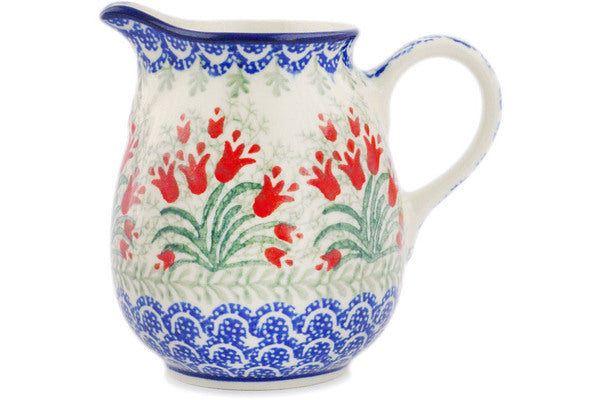 This Crimson Bells 12 oz Pitcher was handmade and hand decorated in Boleslawiec, Poland by skilled artisans according to old traditional methods. This Polish stoneware is microwave, dishwasher, freezer, and oven safe up to 480°F. It does not contain lead or cadmium. It is part of the Crimson Bells Collection.
