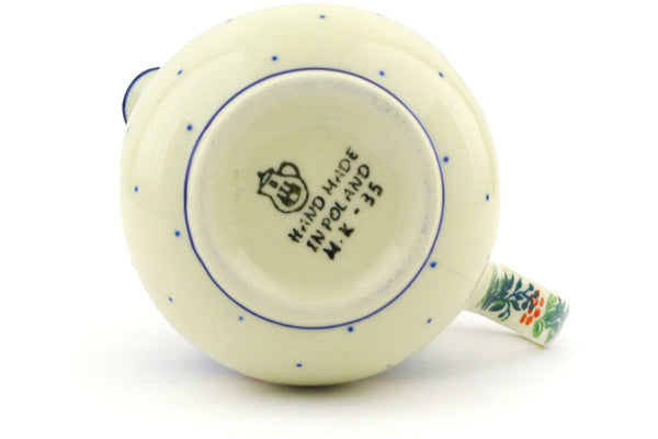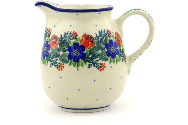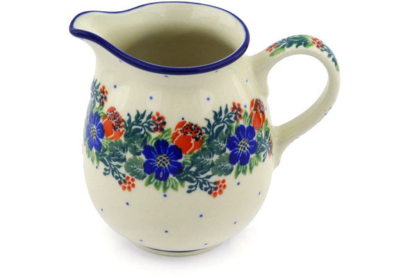 This Polish Wreath 12 oz Pitcher was handmade and hand decorated in Boleslawiec, Poland by skilled artisans according to old traditional methods. This Polish stoneware is microwave, dishwasher, freezer, and oven safe up to 480°F. It does not contain lead or cadmium. It is part of the Polish Wreath Collection.
