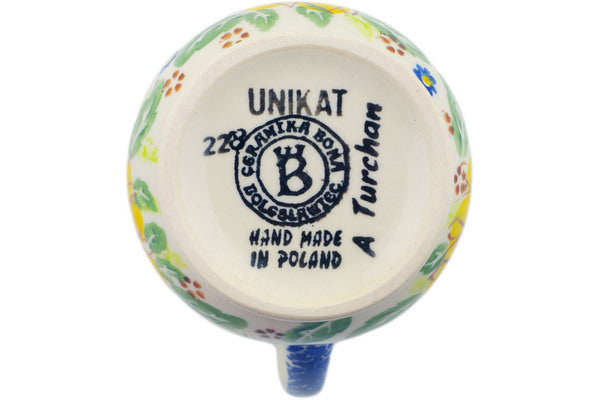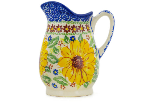 This Sunflower Yellow Petal Bliss 12 oz Creamer was handmade and hand decorated in Boleslawiec, Poland by skilled artisans according to old traditional methods. This is a Polish pottery Signature Unikat, which means that it has been hand painted with both sponges and brushes and it is signed by the artist who painted it. Unikat pieces are the most intricate works of art. Larger Unikat items take hours of very careful work to finish. This Polish stoneware is microwave, dishwasher, freezer, and oven safe up to 480°F. It does not contain lead or cadmium. It is part of the Sunflower Yellow Petal Bliss Collection.