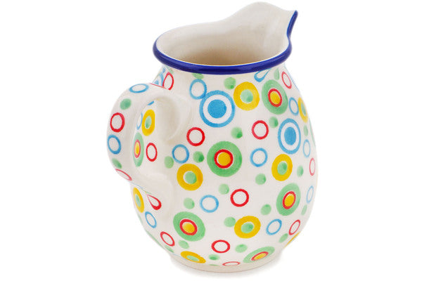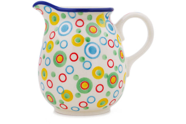 This Retro Olives 17 oz Pitcher was handmade and hand decorated in Boleslawiec, Poland by skilled artisans according to old traditional methods. This is a Polish pottery Signature Unikat, which means that it has been hand painted with both sponges and brushes and it is signed by the artist who painted it. Unikat pieces are the most intricate works of art. Larger Unikat items take hours of very careful work to finish. This Polish stoneware is microwave, dishwasher, freezer, and oven safe up to 480°F. It does not contain lead or cadmium. It is part of the Retro Olives Collection.