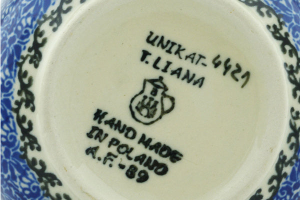 This Rhapsody In Blue 17 oz Pitcher was handmade and hand decorated in Boleslawiec, Poland by skilled artisans according to old traditional methods. This is a Polish pottery Signature Unikat, which means that it has been hand painted with both sponges and brushes and it is signed by the artist who painted it. Unikat pieces are the most intricate works of art. Larger Unikat items take hours of very careful work to finish. This Polish stoneware is microwave, dishwasher, freezer, and oven safe up to 480°F. It does not contain lead or cadmium. It is part of the Rhapsody In Blue Collection.