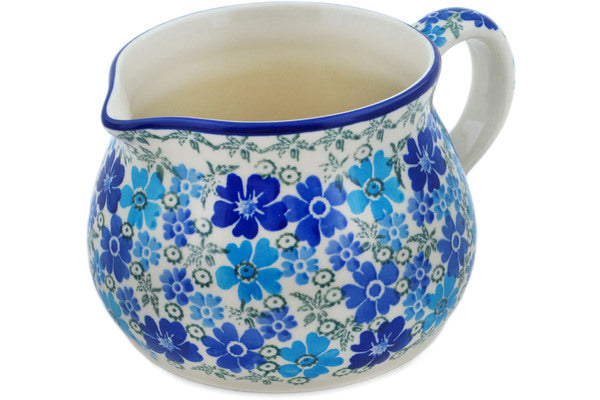 This Fields Of Blue 34 oz Pitcher was handmade and hand decorated in Boleslawiec, Poland by skilled artisans according to old traditional methods. This is a Polish pottery Signature Unikat, which means that it has been hand painted with both sponges and brushes and it is signed by the artist who painted it. Unikat pieces are the most intricate works of art. Larger Unikat items take hours of very careful work to finish. This Polish stoneware is microwave, dishwasher, freezer, and oven safe up to 480°F. It does not contain lead or cadmium. It is part of the Fields Of Blue Collection.