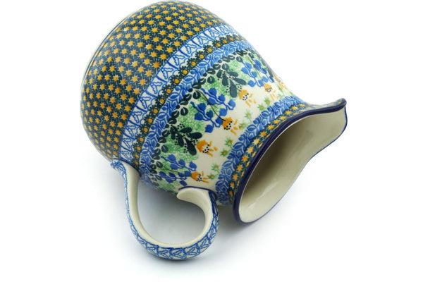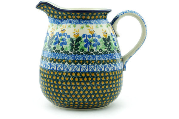 This Bluebells And Irises 67 oz Pitcher was handmade and hand decorated in Boleslawiec, Poland by skilled artisans according to old traditional methods. This is a Polish pottery Signature Unikat, which means that it has been hand painted with both sponges and brushes and it is signed by the artist who painted it. Unikat pieces are the most intricate works of art. Larger Unikat items take hours of very careful work to finish. This Polish stoneware is microwave, dishwasher, freezer, and oven safe up to 480°F. It does not contain lead or cadmium. It is part of the Bluebells And Irises Collection.