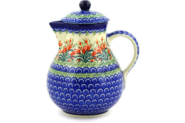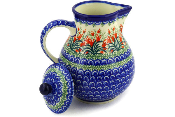 This Crimson Bells 34 oz Pitcher with Lid was handmade and hand decorated in Boleslawiec, Poland by skilled artisans according to old traditional methods. This Polish stoneware is microwave, dishwasher, freezer, and oven safe up to 480°F. It does not contain lead or cadmium. It is part of the Crimson Bells Collection.