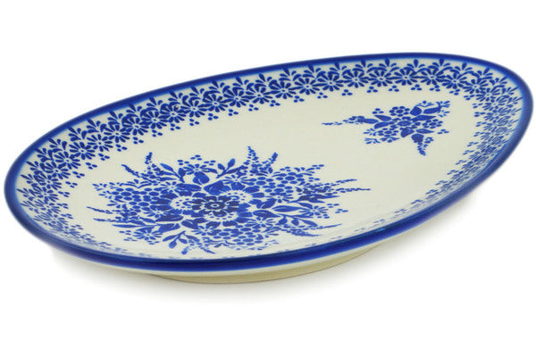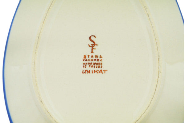 This Morning Frost 10" Platter was handmade and hand decorated in Boleslawiec, Poland by skilled artisans according to old traditional methods. This is a Polish pottery Signature Unikat, which means that it has been hand painted with both sponges and brushes and it is signed by the artist who painted it. Unikat pieces are the most intricate works of art. Larger Unikat items take hours of very careful work to finish. This Polish stoneware is microwave, dishwasher, freezer, and oven safe up to 480°F. It does not contain lead or cadmium. It is part of the Morning Frost Collection.
