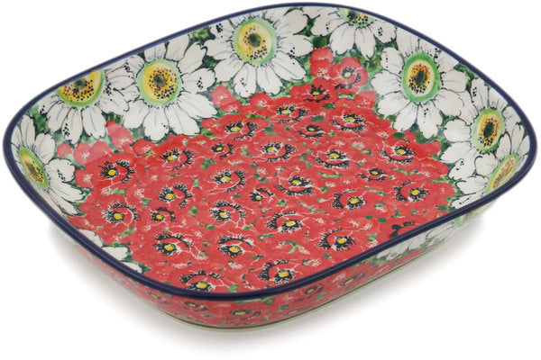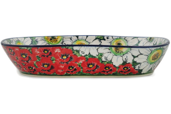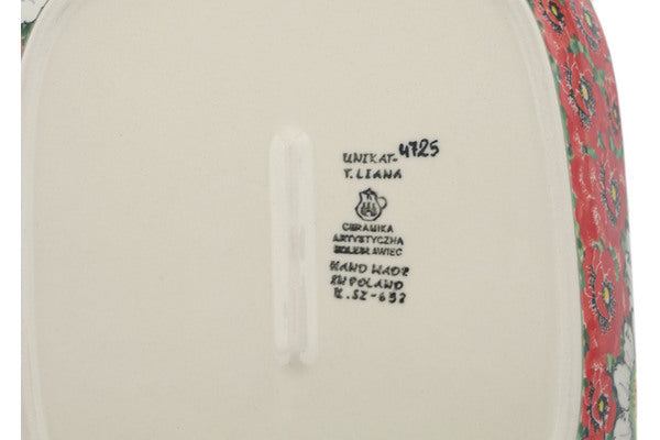 This Sweet Red Petals 10" Platter was handmade and hand decorated in Boleslawiec, Poland by skilled artisans according to old traditional methods. This is a Polish pottery Signature Unikat, which means that it has been hand painted with both sponges and brushes and it is signed by the artist who painted it. Unikat pieces are the most intricate works of art. Larger Unikat items take hours of very careful work to finish. This Polish stoneware is microwave, dishwasher, freezer, and oven safe up to 480°F. It does not contain lead or cadmium. It is part of the Sweet Red Petals Collection.