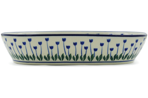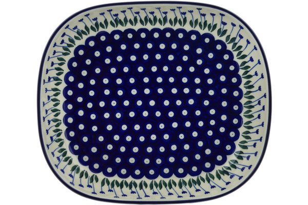 This Blue Tulip Peacock 12" Platter was handmade and hand decorated in Boleslawiec, Poland by skilled artisans according to old traditional methods. This Polish stoneware is microwave, dishwasher, freezer, and oven safe up to 480°F. It does not contain lead or cadmium. It is part of the Blue Tulip Peacock Collection.