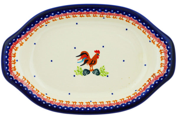 This Rooster Doodle-Do 12" Platter was handmade and hand decorated in Boleslawiec, Poland by skilled artisans according to old traditional methods. This is a Polish pottery Signature Unikat, which means that it has been hand painted with both sponges and brushes and it is signed by the artist who painted it. Unikat pieces are the most intricate works of art. Larger Unikat items take hours of very careful work to finish. This Polish stoneware is microwave, dishwasher, freezer, and oven safe up to 480°F. It does not contain lead or cadmium. It is part of the Rooster Doodle-Do Collection.